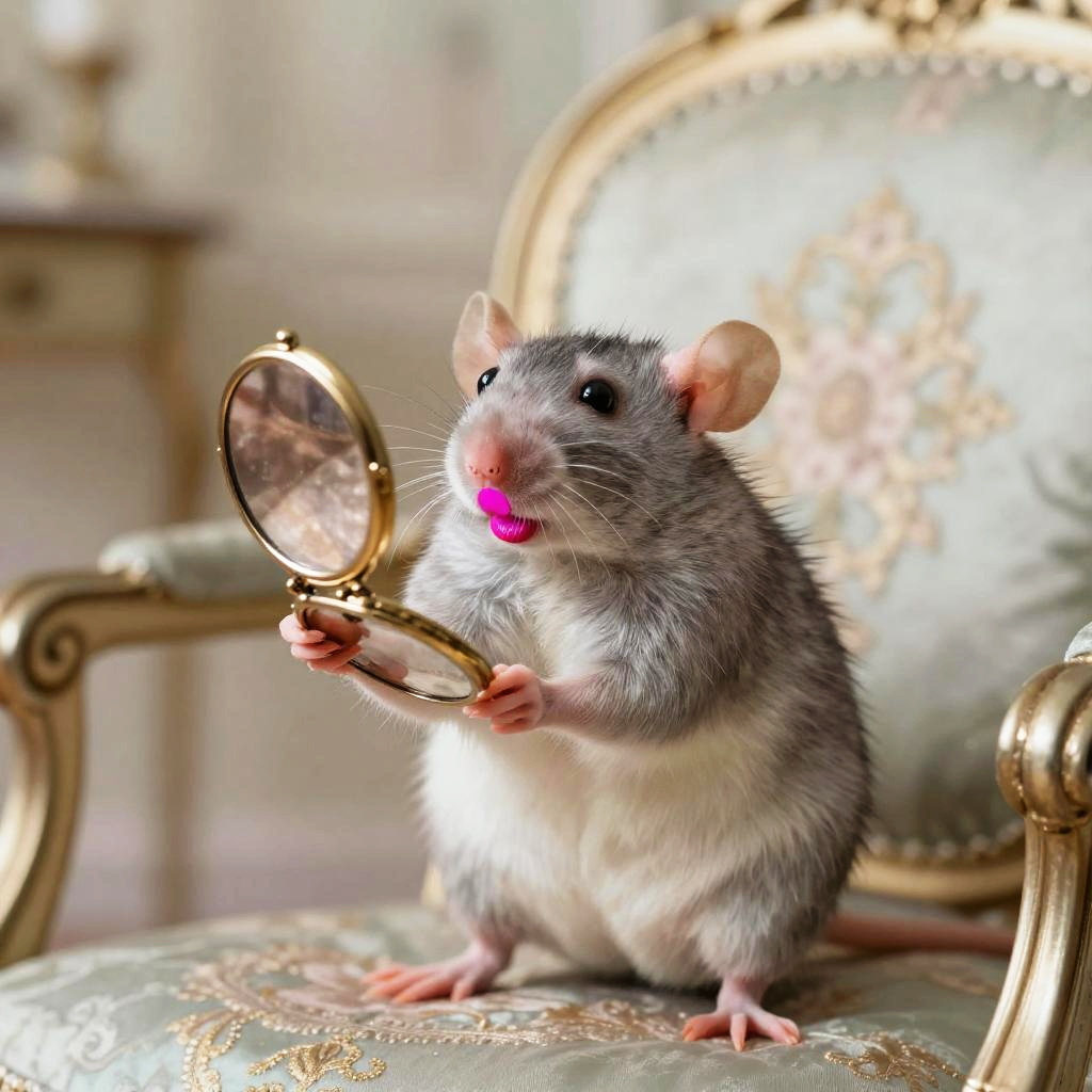 A rat with lipstick on its whiskers and lips, sitting on a vintage wooden table, dimly lit room with soft shadows, detailed fur texture, whimsical and quirky atmosphere, realistic but slightly stylized.