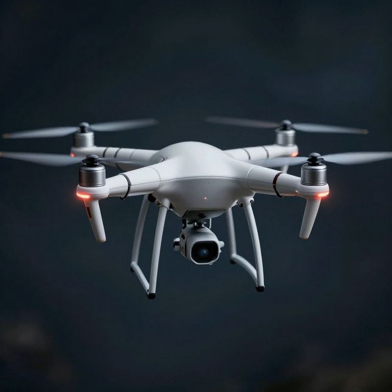Photograph of a sleek, white quadcopter drone with four propellers, each featuring a small red LED light near the motor. The drone has a central camera mounted below its body, which is slightly tilted upward. The propellers are spinning, creating a blurred effect. The background is a dark, out-of-focus sky, providing a stark contrast to the drone's white color. The overall design is modern and minimalist, with smooth, cylindrical arms connecting the propellers to the central body. The image exudes a sense of advanced technology and precision engineering.