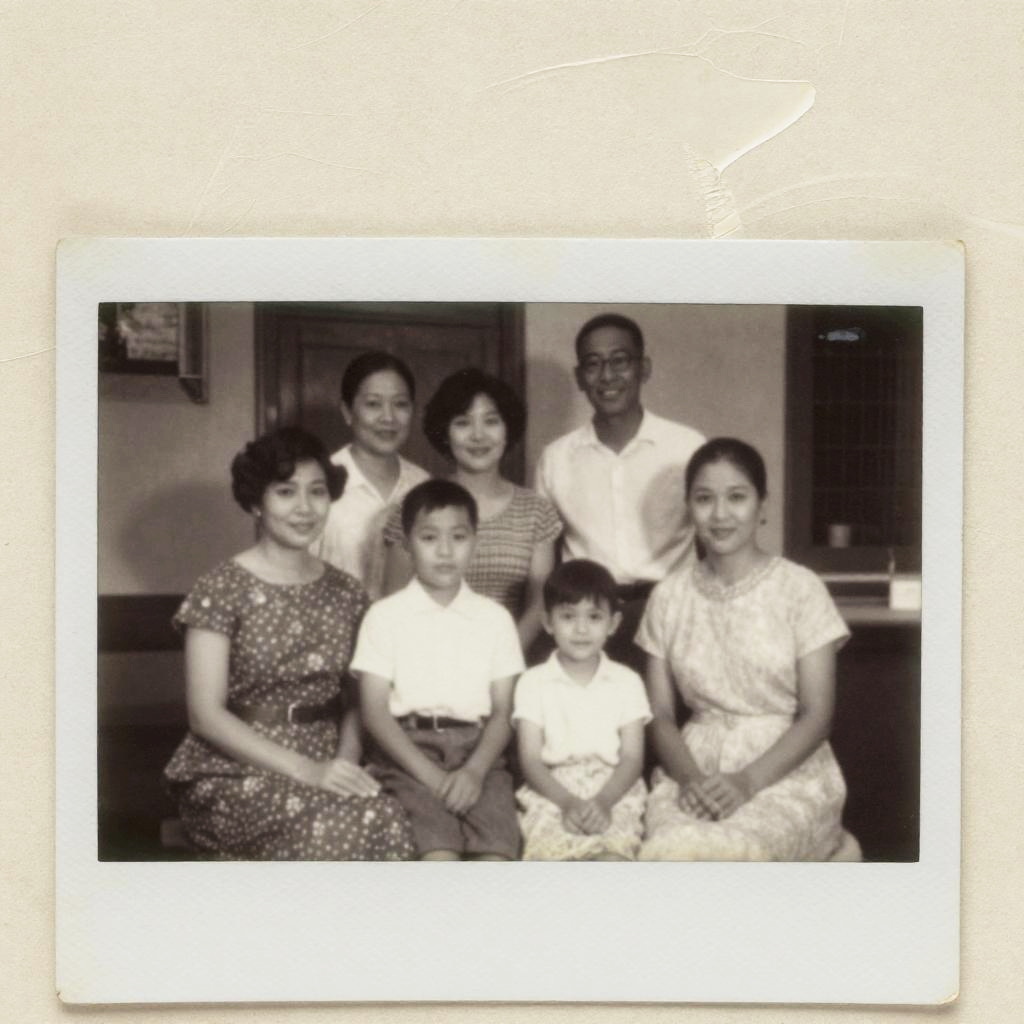 Artistic old photo texture overlay highlighting warp and wrinkles on fragile photographic paper, combined with muted tones, light leaks, and soft focus applied on a classic family gathering scene, capturing the essence of a treasured relic from the past.