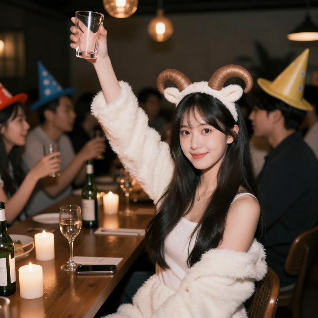 Photograph of a lively party scene with a young Asian woman in a fluffy white costume and ram horn headband, raising a glass. She has long black hair and a cheerful expression. Surrounding her are diverse partygoers in colorful hats, dimly lit with candles, glasses, and bottles on a wooden table.