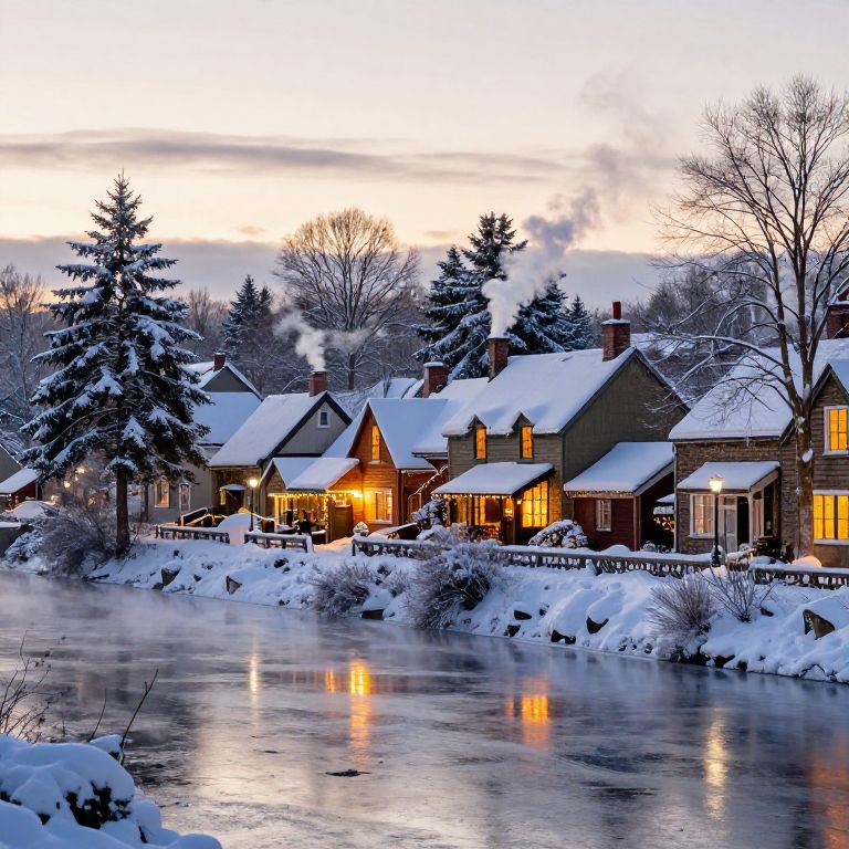 Stratham winter scene, snow-covered village with warmly lit cottages, smoke rising from chimneys, frozen river reflecting the pale winter sun, snow-laden pine trees surrounding the town, cozy and festive atmosphere with intricate details.