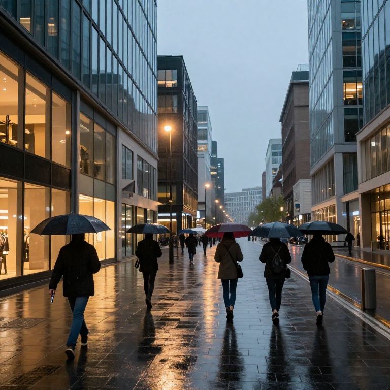Photograph of a rainy urban street at dusk, featuring a row of modern glass buildings on either side. Silhouetted pedestrians, mostly dressed in dark coats, walk down the wet, reflective sidewalk, holding black or red umbrellas. Warm yellow lights from store windows contrast with the cool blue sky and streetlights. The street is lined with tall, rectangular buildings, creating a narrow, linear perspective. The wet pavement glistens, reflecting the lights and umbrellas. The overall mood is cool and slightly gloomy, with a mix of natural and artificial light.