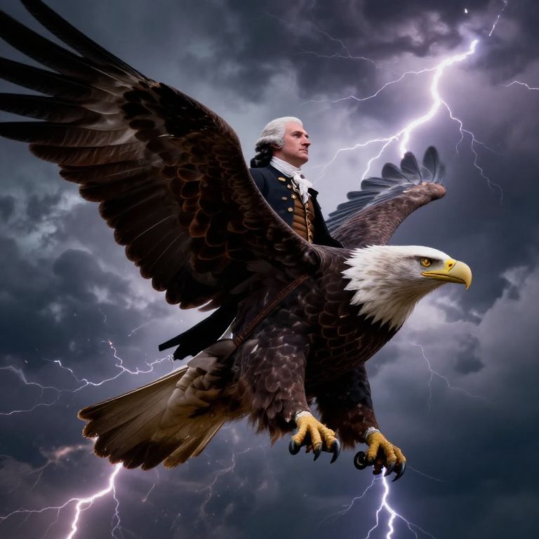 George Washington riding a powerful bald eagle through stormy skies, bolts of lightning illuminating the dramatic scene, mythological and heroic vibe, rich colors, intricate eagle feathers and realistic 18th century clothing, dynamic composition