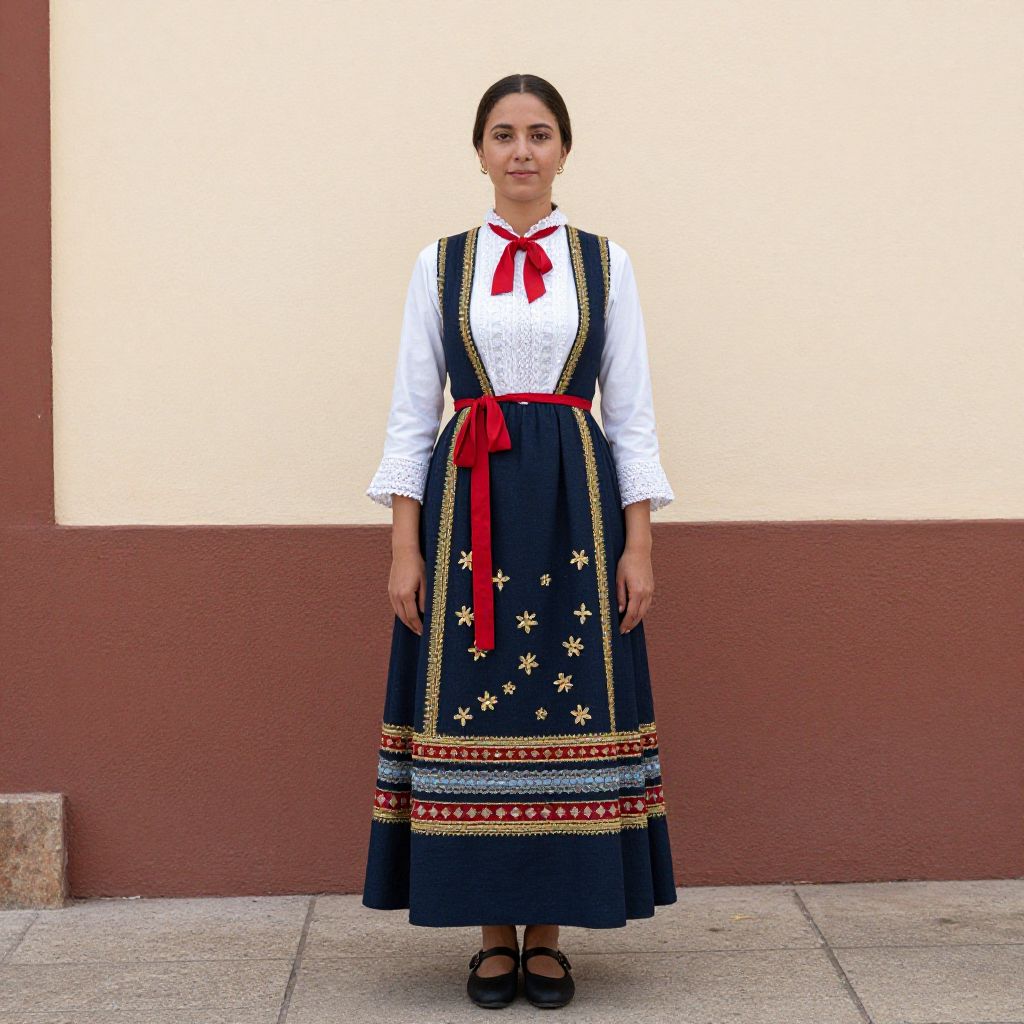 "Traditional Portuguese Dress, woman in traditional dress standing in front of a wall"