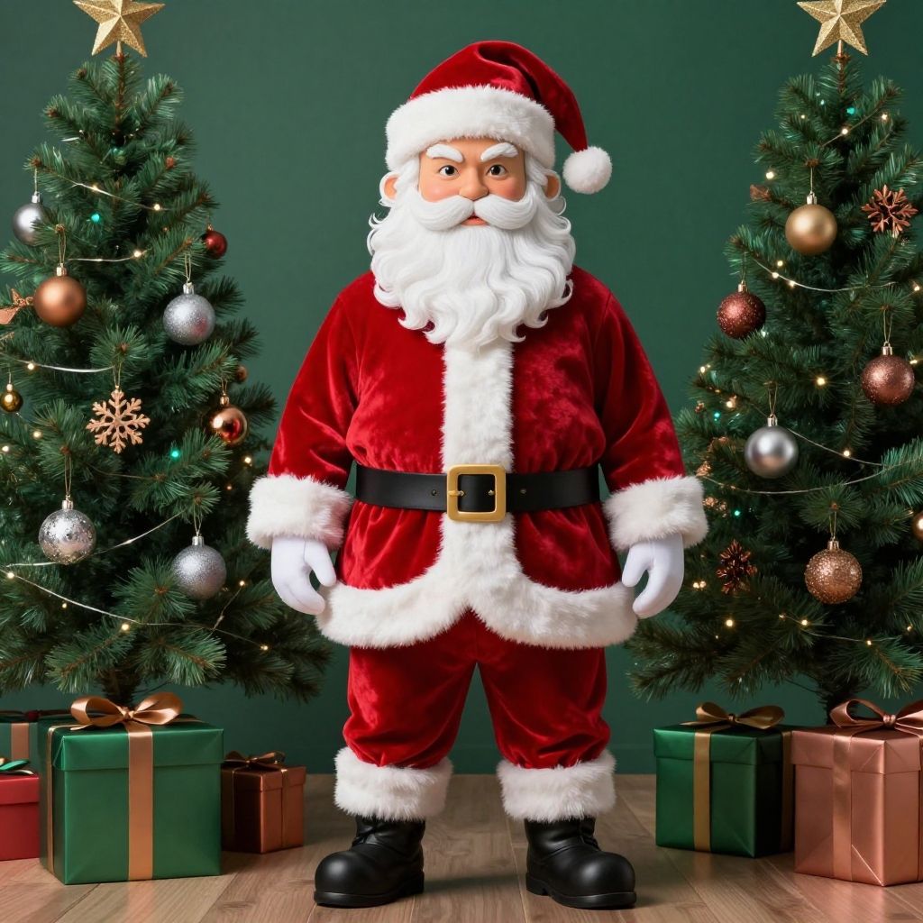 Photograph of a festive Santa Claus with a white beard, red velvet suit, and black boots, standing between two decorated Christmas trees with gifts and star