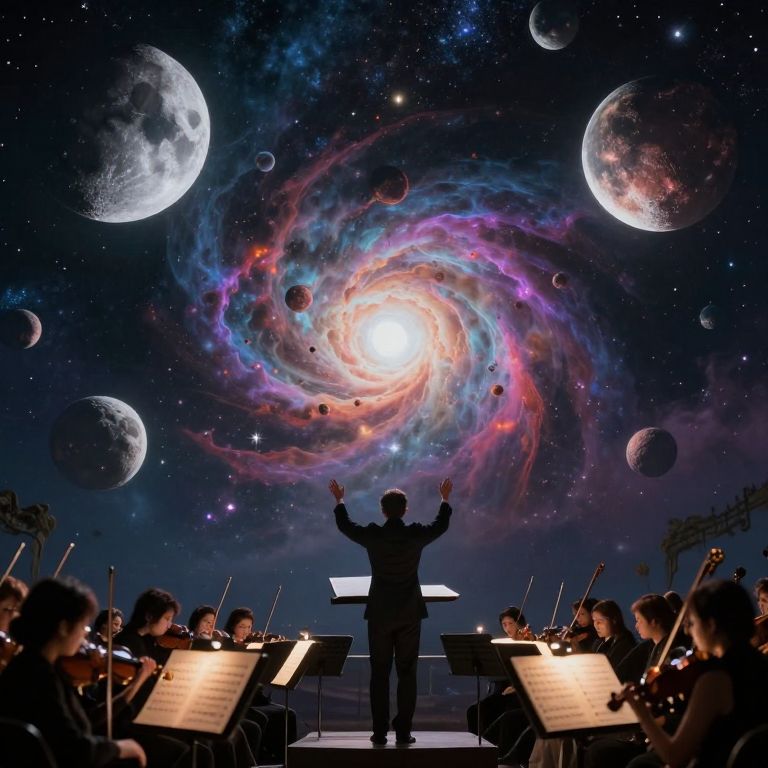 Conductor with arms raised, standing before an orchestra, against a cosmic backdrop of swirling galaxies and planets. Digital art.