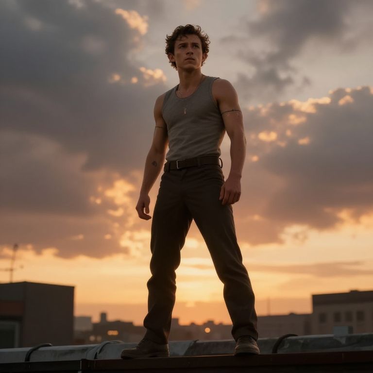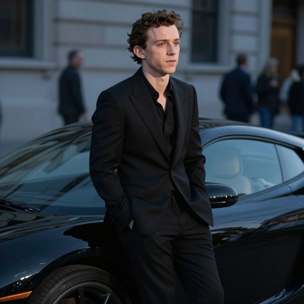 Black suit Tom Holland standing confidently on a rooftop at night, illuminated by city lights, cinematic style, sharp details, ultra-realistic, dramatic shadows