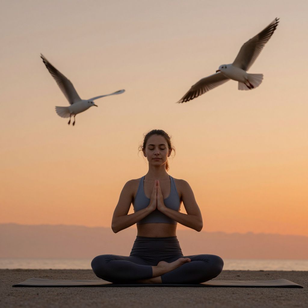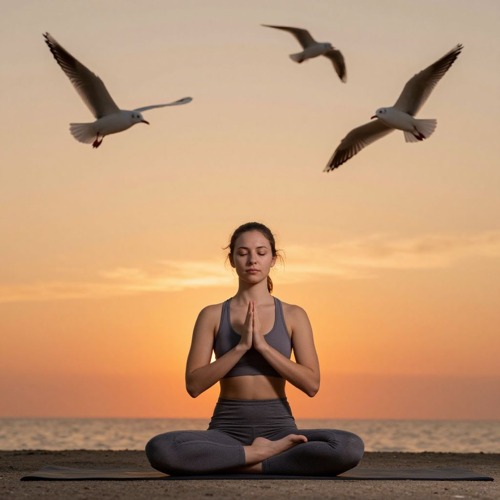 Seated in a serene prayer pose on a yoga mat by the shoreline, a young woman meditates as three seagulls soar gracefully against an orange-hued sunset sky, embodying feelings of empowerment and tranquility.