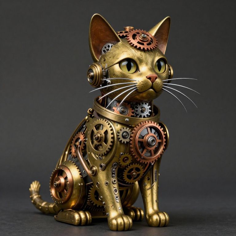 Steampunk-style gold cat statue with intricate copper gears and cogs, sitting on dark background. Detailed mechanical design with large green eyes. Photoreal