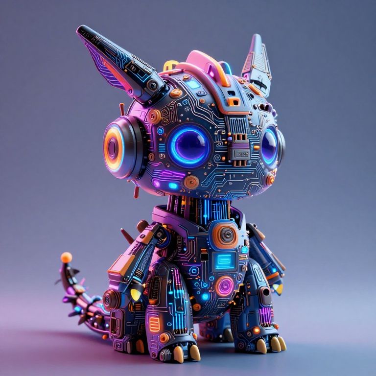 Photograph of a golden, sitting, robotic cat sculpture with large, expressive eyes. The cat is made of interlocking gears and cogs, featuring copper and silver metal components. Its ears are pointed, and it has a detailed, metallic whisker system. The background is a solid, dark gray, highlighting the cat's intricate mechanical design. The cat's body is cylindrical with a tail that curves slightly upward. The texture of the metal is smooth and polished, giving it a sleek, futuristic appearance. The overall style is steampunk, blending mechanical elements with a whimsical, feline form.