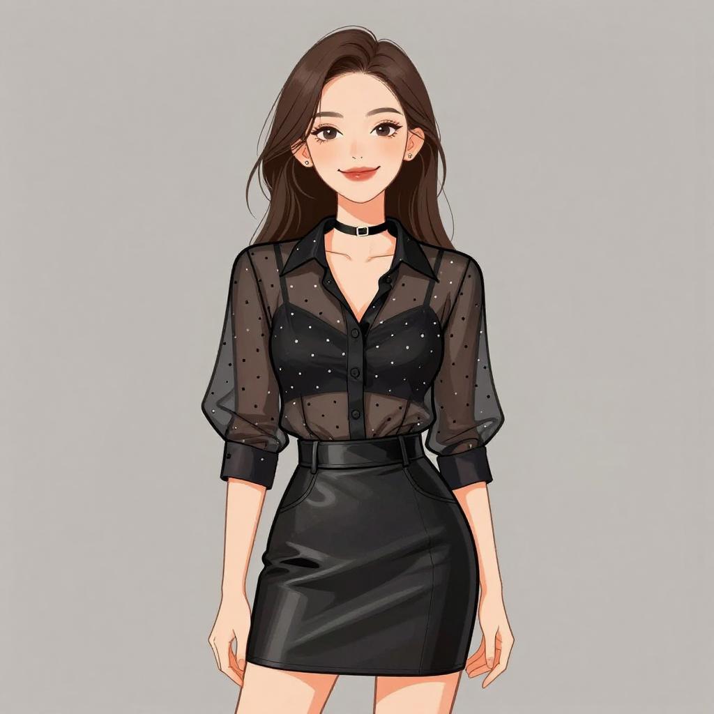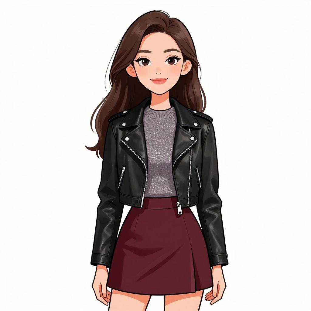 Woman with pretty face and pretty hair. smiling Woman, casual, white fitted short-sleeve top, scoop neckline, red A-line mini skirt in satin finish, metallic sheen, high-waisted, attached long skinny scarf in mottled brown and beige tones, draped around neck falling alongside torso. --sref 1467