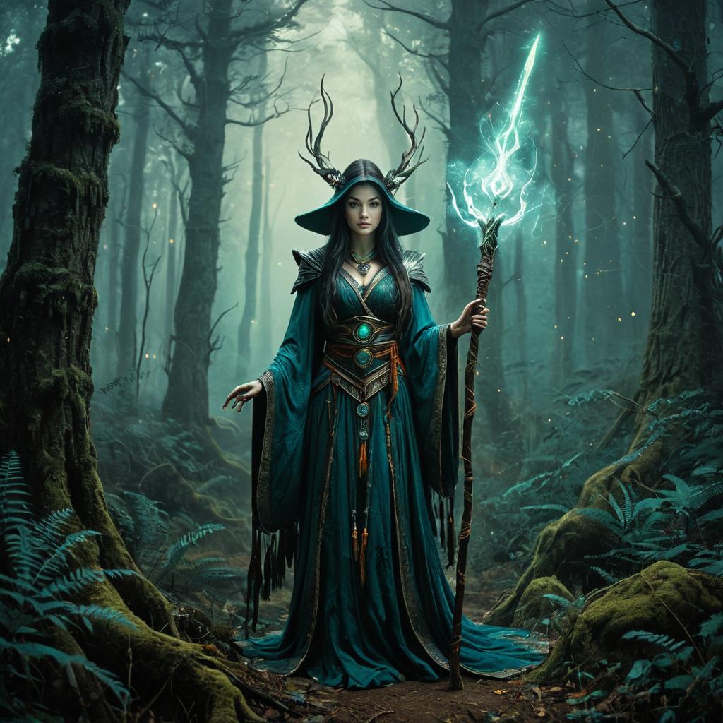 Full-body digital portrait of a fantasy forest sorceress standing in an ancient enchanted woodland surrounded by ethereal mist. She wears an elaborate deep teal robe and a pointed hat, adorned with intricate armor and glowing gemstone jewelry. The sorceress holds a tall staff emitting blue magical energy, set against a mystical foggy forest backdrop with towering trees and soft glowing lights.