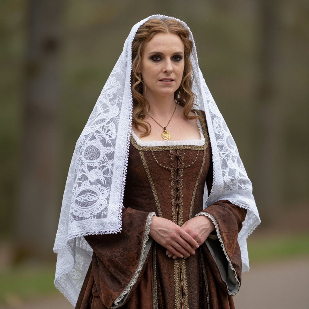 Photograph of a Caucasian woman with wavy brown hair, wearing a brown, medieval-style dress with gold embroidery and a white lace veil. She has fair skin, is standing outdoors with a blurred forest background, and her hands are clasped in front. She wears a gold necklace with a pendant. Her expression is calm, and her makeup is subtle. The lace veil features intricate floral patterns, adding a delicate texture to her ensemble. The overall mood is historical and serene.