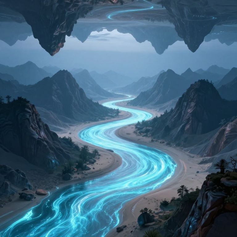 In a realm where gravity bends and dreams take form, a luminous river of bioluminescent sand winds through inverted mountains, casting an ethereal glow that whispers of infinite possibility and the quiet serenity of a world turned upside down.