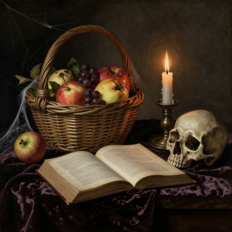 Detailed vanitas painting showing a decaying fruit basket, an open book with yellowed pages, a burnt-out candle, and a skull resting on a velvet cloth, surrounded by delicate spider webs, illuminated by soft, diffused candlelight in a dimly lit room.