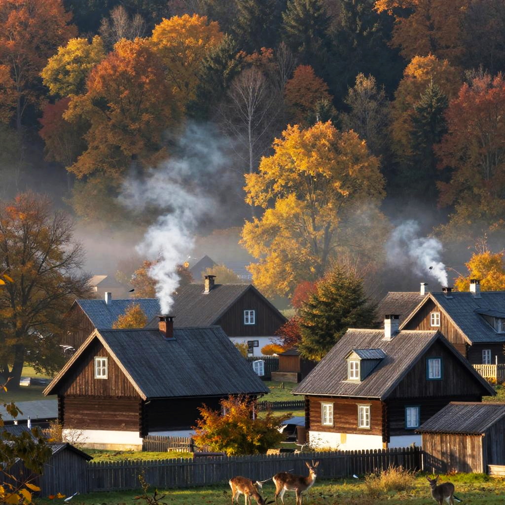 Photograph of rustic wooden houses with smoke rising, surrounded by autumn trees with vibrant orange and yellow leaves, and grazing deer in the foreground.