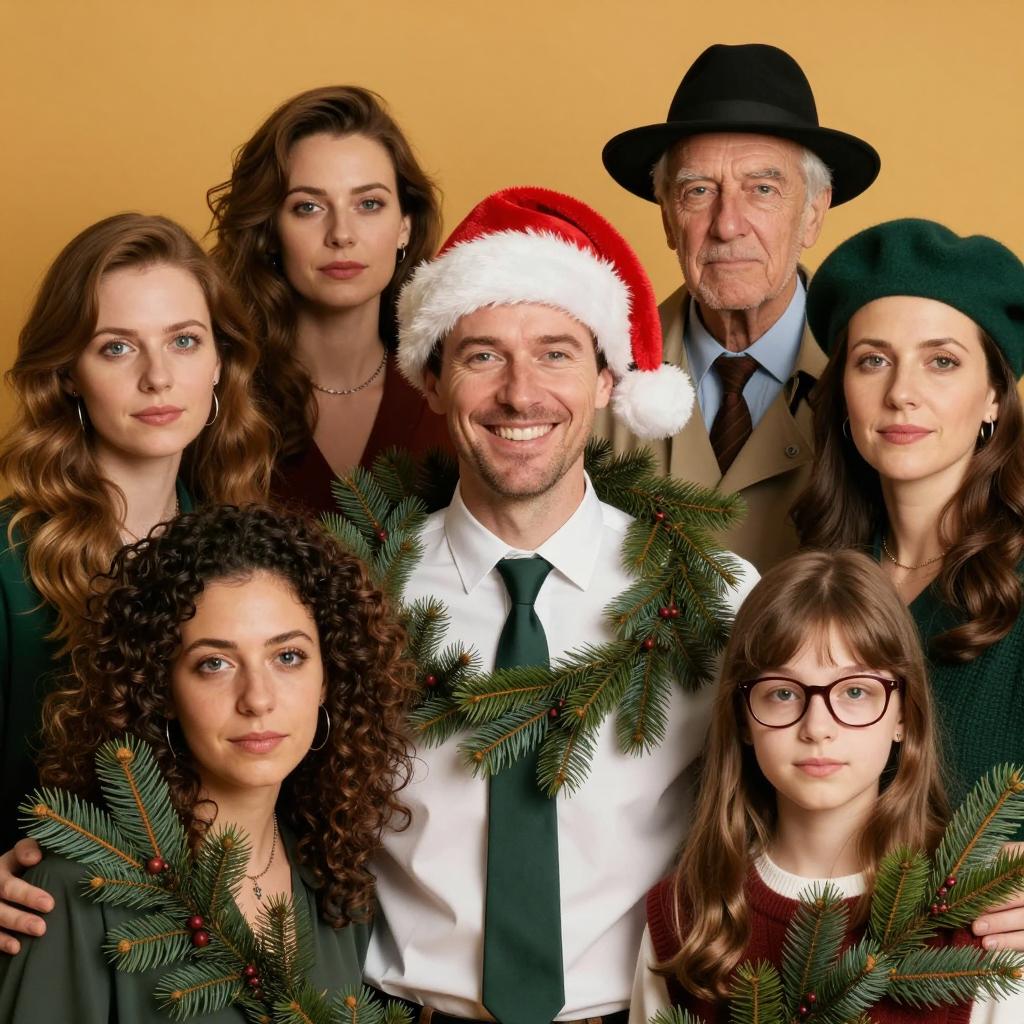 Photograph of four people in a dimly lit room. Three men in red Santa suits with white fur trim and black belts face a woman with red hair, wearing a black turtleneck and blue jeans. The man on the right gestures with his hands. Background includes framed pictures on dark patterned walls and a doorway.