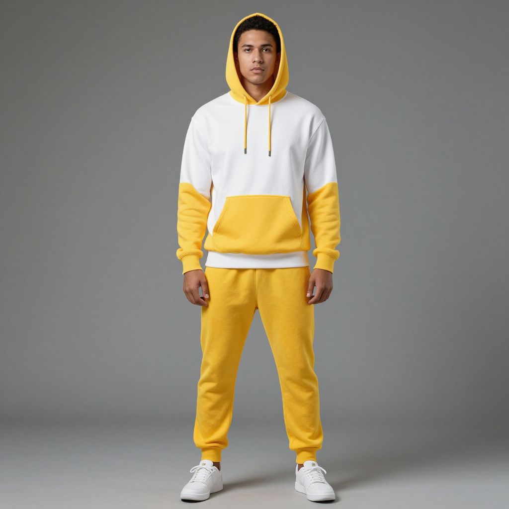 Sports Outfit Male Costume, man in a yellow and white hoodie poses for a picture