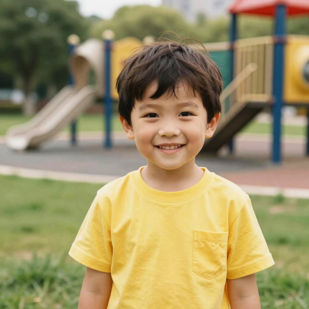 Realistic photo.A cheerful boy, wearing a bright yellow t-shirt, smiling at the camera in a park with a playful playground on a sunny day. realistic photo