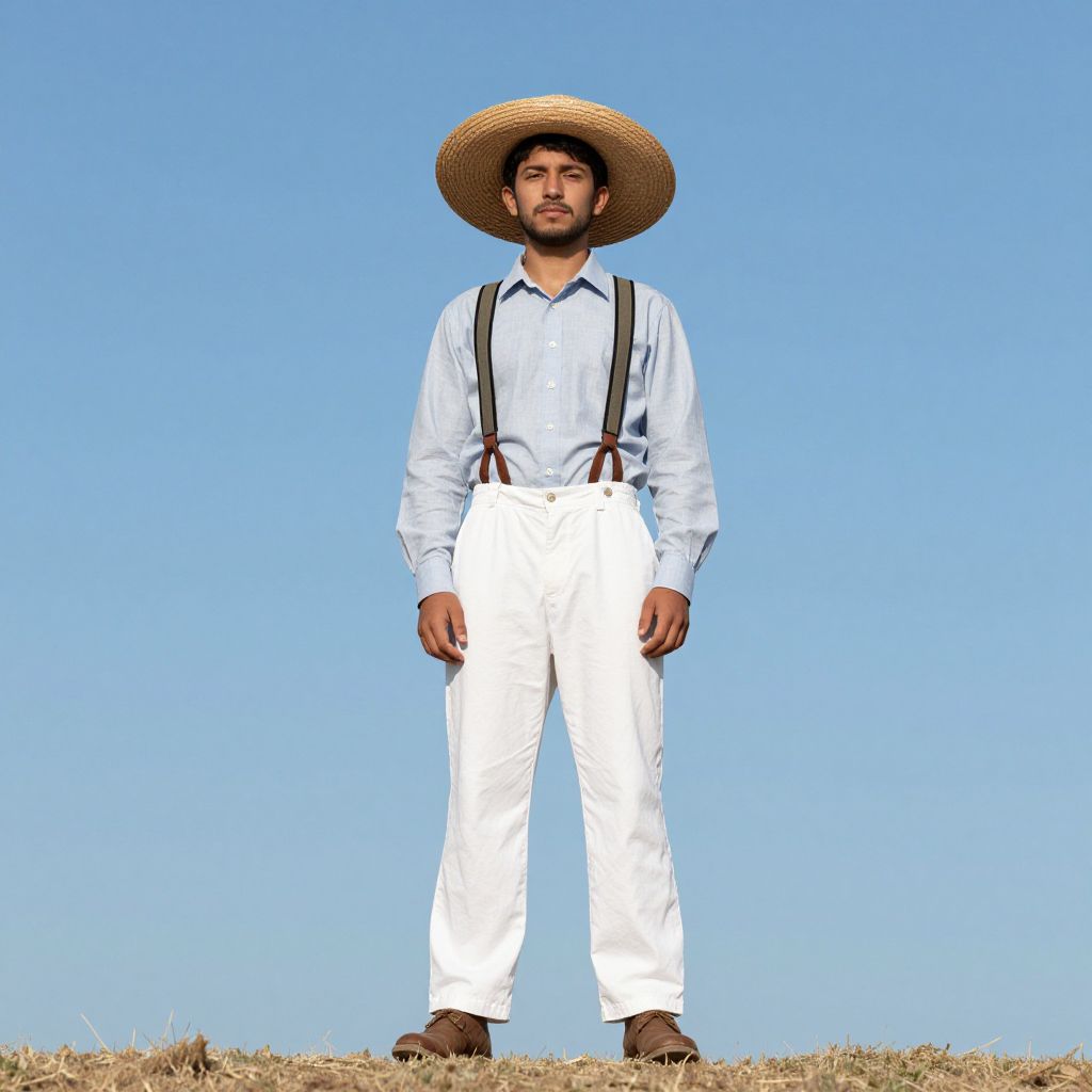 Photograph of a young man standing on a grassy hill under a clear blue sky. He has medium brown skin, a short beard, and dark hair peeking from under a large, straw cowboy hat. He wears a white long-sleeve button-up shirt with black suspenders over high-waisted white pants and brown boots. His stance is confident and relaxed, with arms slightly away from his sides. The bright sunlight casts minimal shadows, highlighting the simplicity of his attire against the vivid blue sky. The grassy hill in the foreground adds a natural texture to the scene.