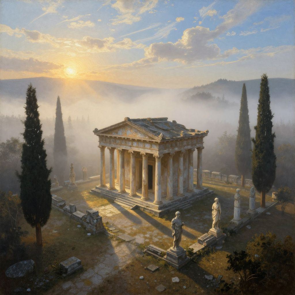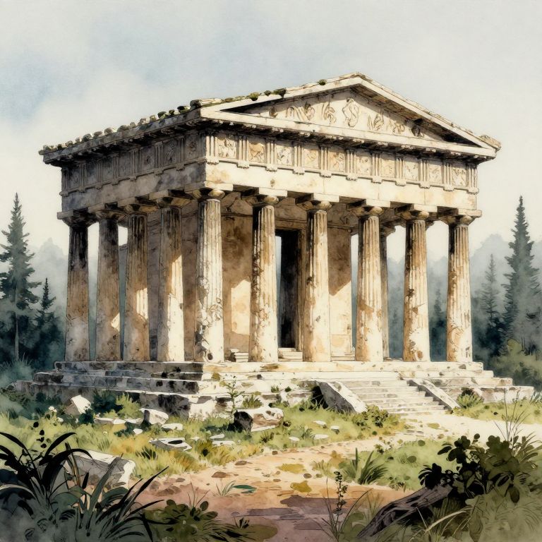 Illustration of an ancient Greek temple with tall, weathered columns, detailed frieze, and a tiled roof, set in a lush, over