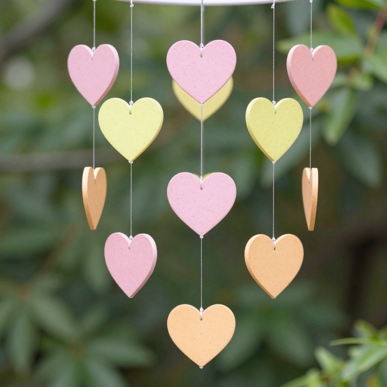 Colorful heart-shaped wind chimes hang gracefully against a blurred green backdrop, featuring nine pastel hearts in shades of pink, yellow, and orange, each adorned with delicate speckles and suspended by thin strings from a circular top piece.