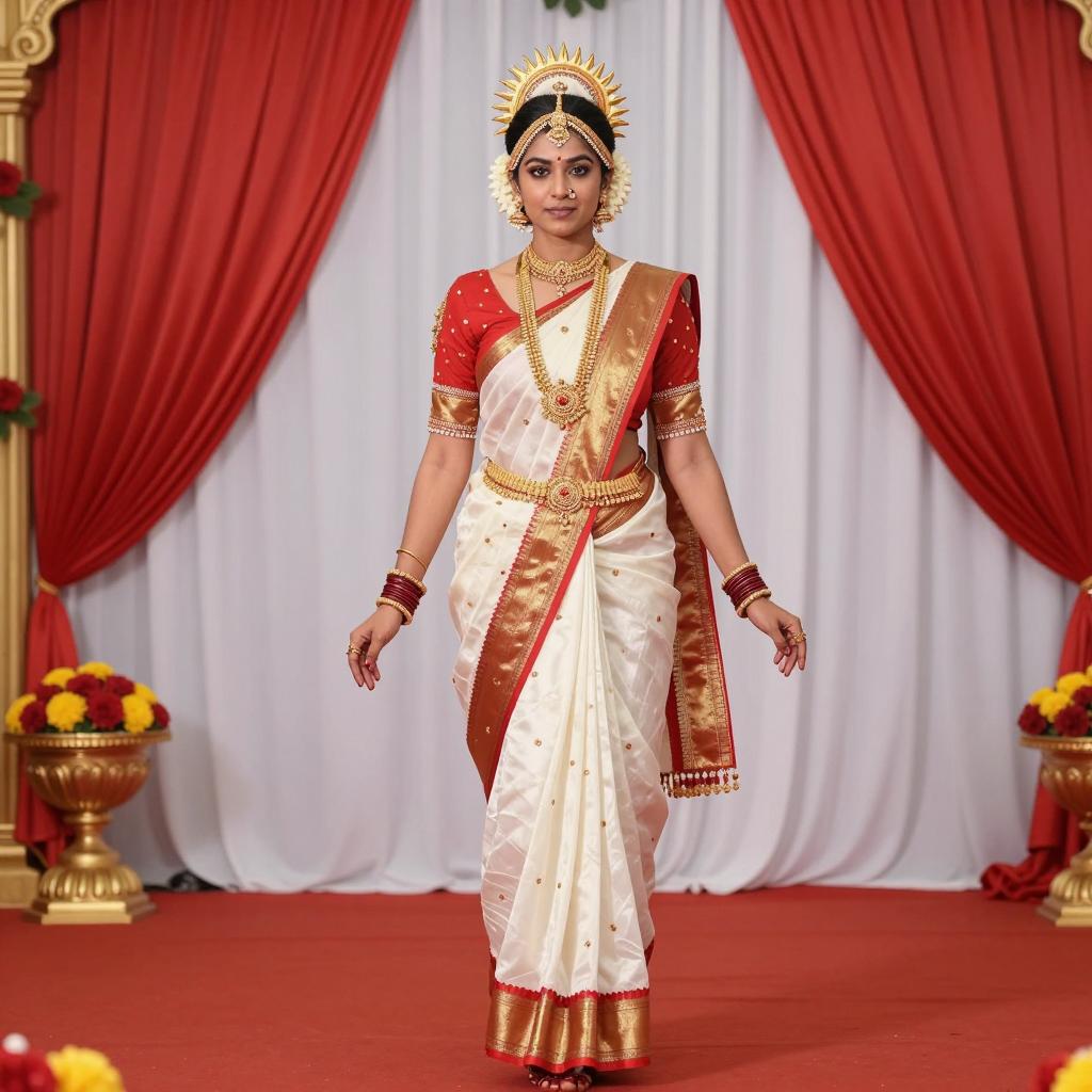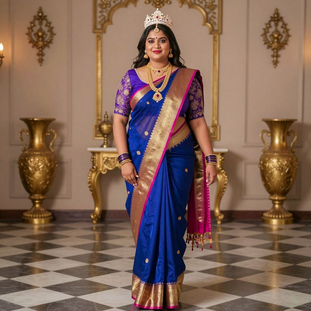 Portrait of a plus-sized Indian woman standing in an opulent room wearing a royal blue saree with gold and pink accents, paired with a purple lace blouse. She dons a jeweled crown, multiple gold necklaces, and matching bangles. The setting features a checkered marble floor, ornate walls, and large decorative gold vases, highlighting a regal and elegant atmosphere.