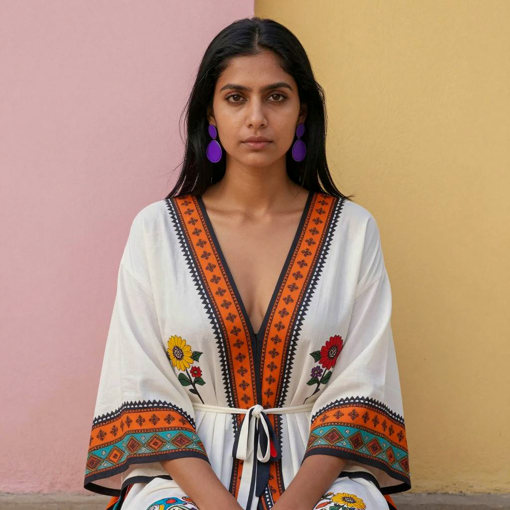Woman with long black hair, purple earrings, deep V-neck white robe with orange and black patterns, sitting against pink and yellow wall. Robe has floral and geometric designs, multicolored sleeves. Patterned pants visible. Serious facial expression. Outdoor setting.
