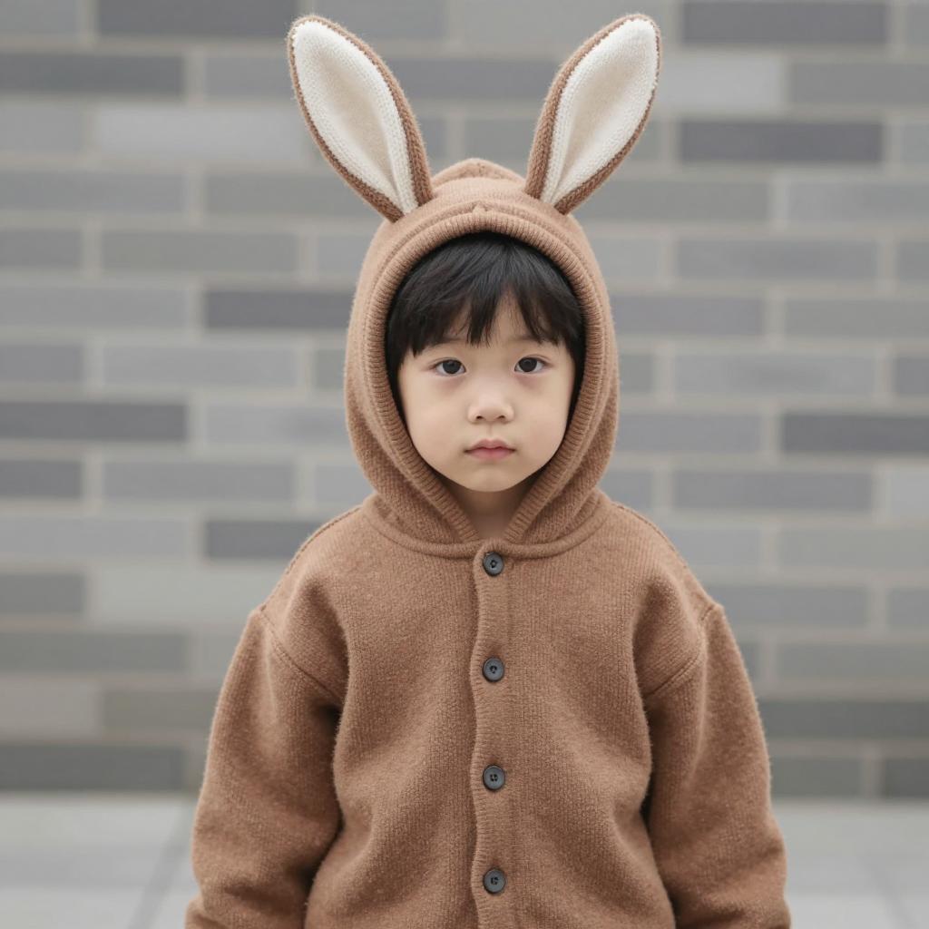 Child almond joy costume, photograph of young boy wearing adorable bear costume, hood with bear ears, beige and orange dress with buttons and shoulder pads, standing in outdoor market, sunny day, blurred background with people and trees, warm light, soft focus, cute, innocent expression, realistic, high quality, child-friendly atmosphere