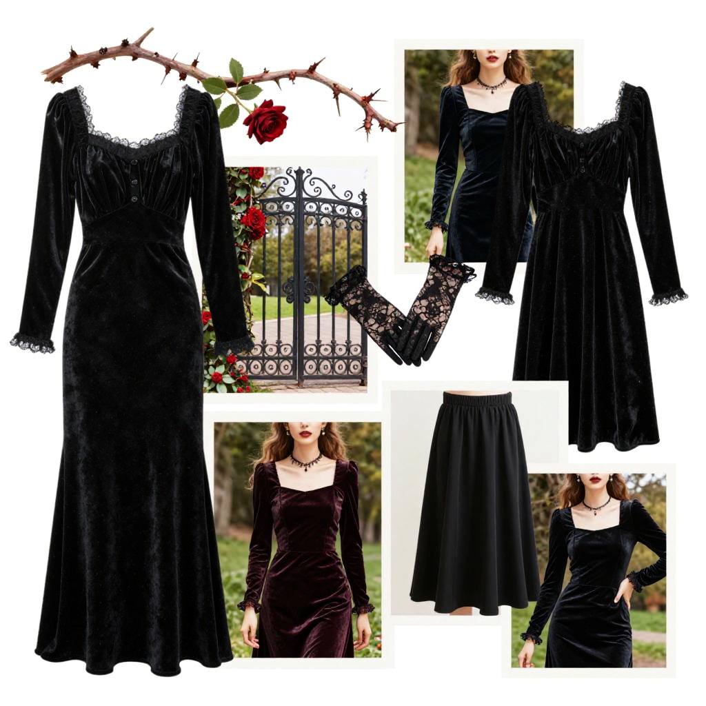 Stylish moodboard collage with a gothic spring, featuring dark velvet dresses and lace gloves. The background includes thorny rose vines and wrought iron gates to add a natural touch. The color palette is bold and colorful, with a high-fashion editorial style. Layered images create a cohesive and visually captivating moodboard, blending vibrant colors with carefully curated fashion elements for an inspiring, trend-focused design.