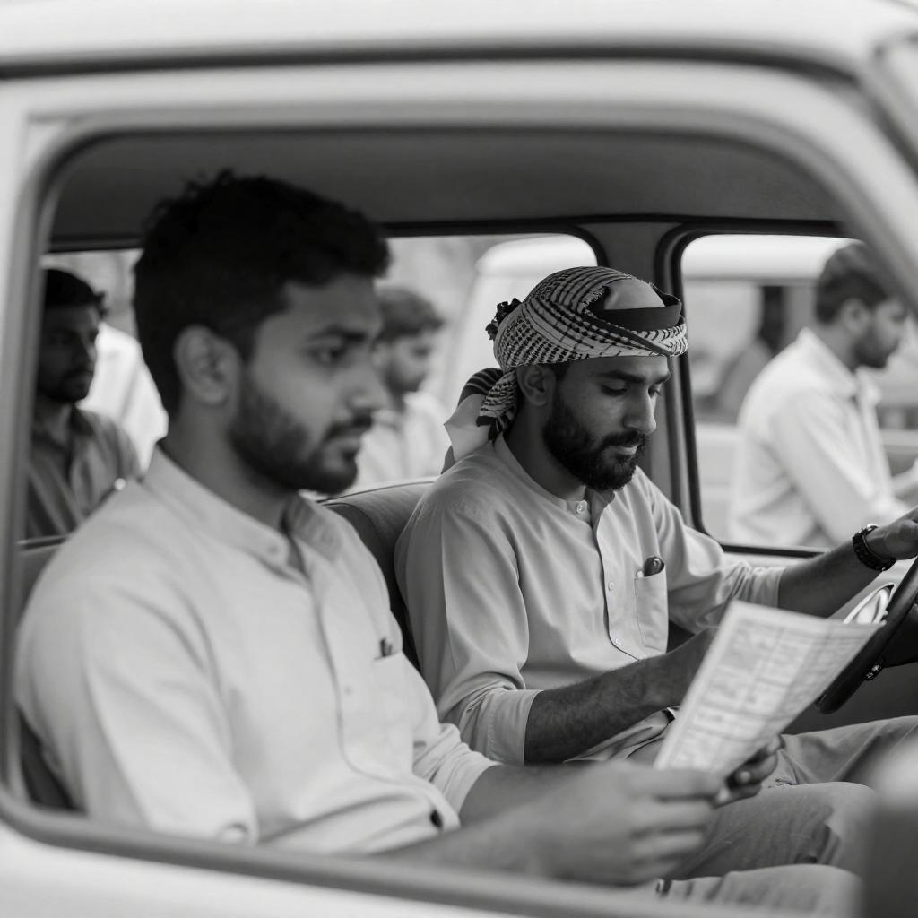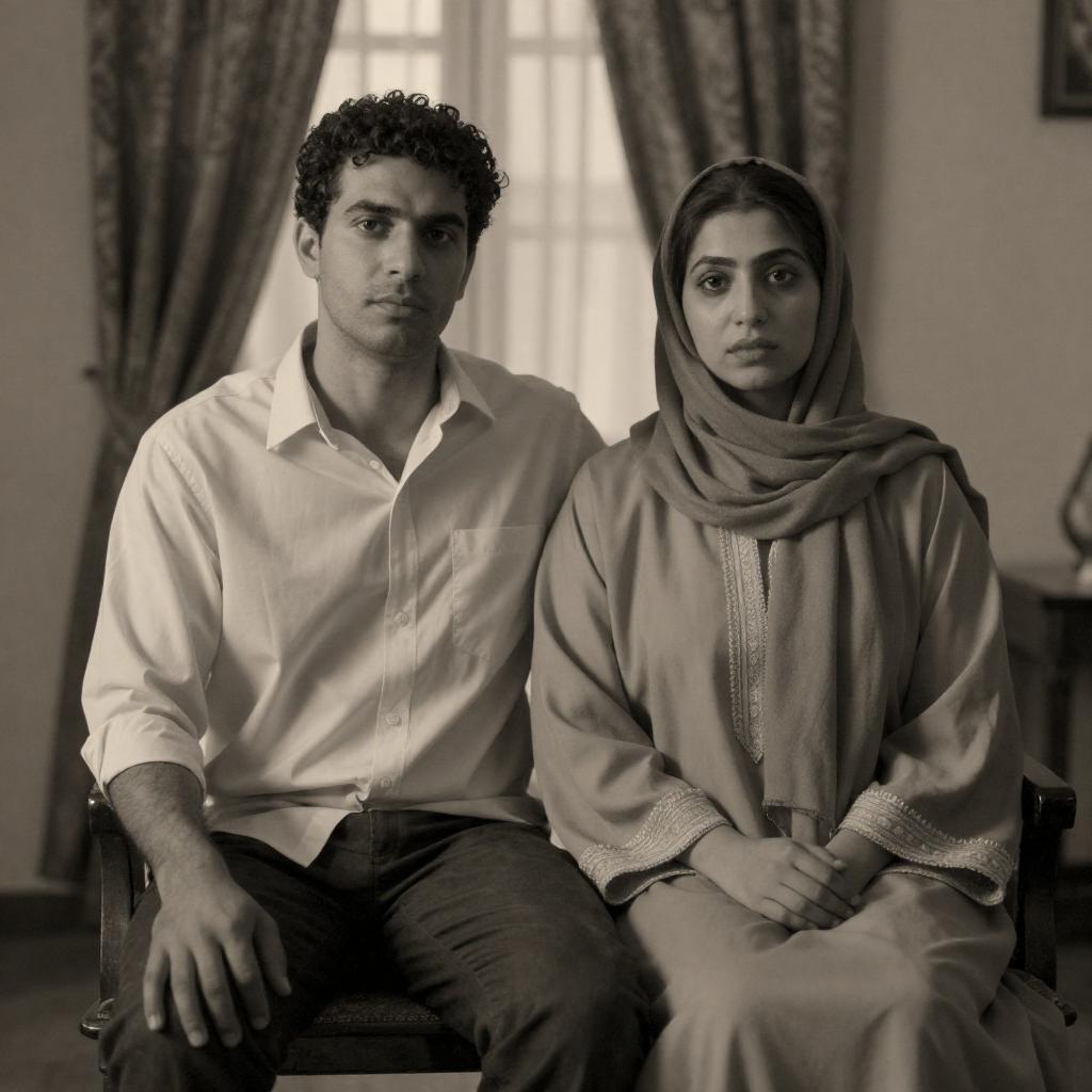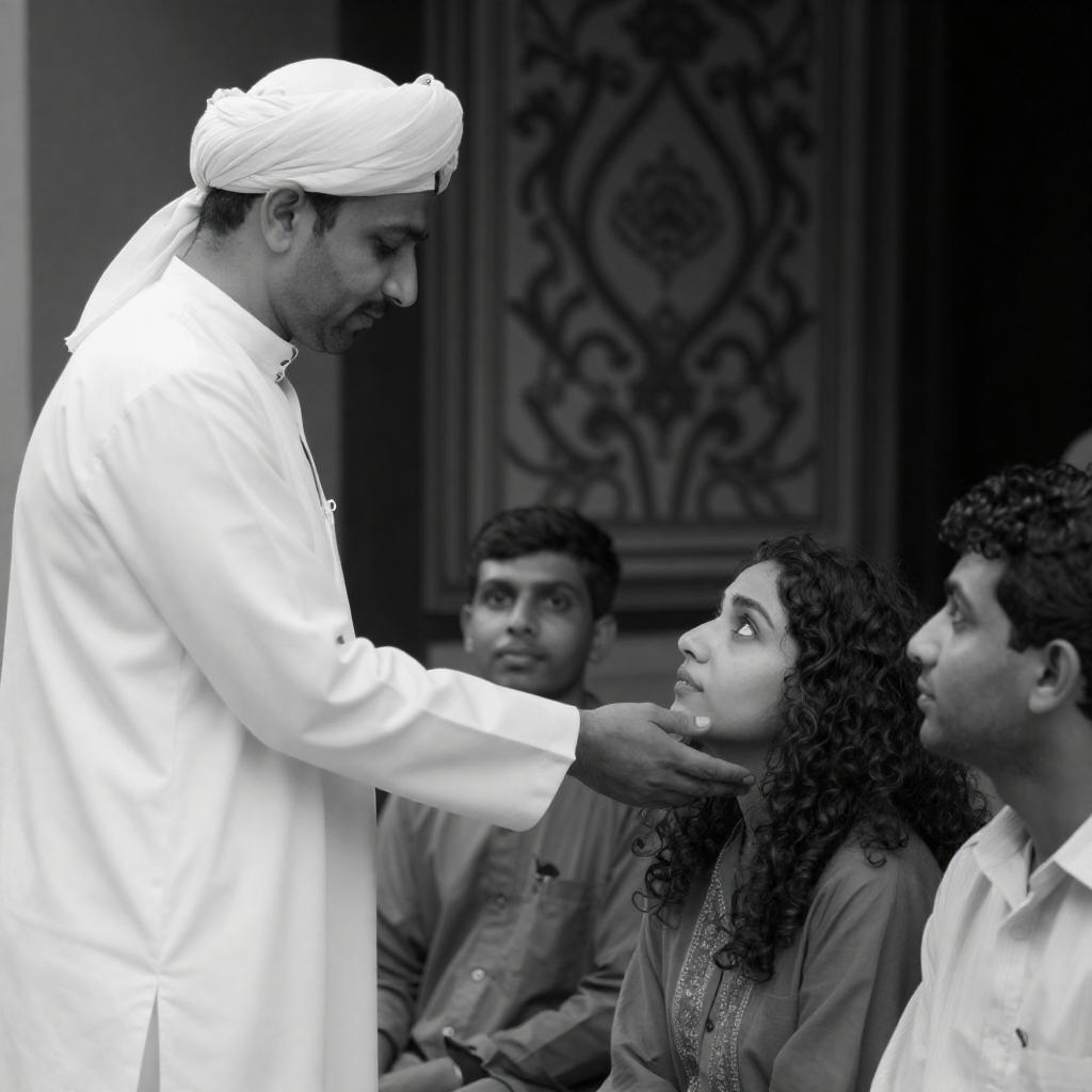 Black-and-white photograph of a man in a white shirt and turban standing, reaching out to a seated woman with curly hair, who is looking up at him. Two other people sit nearby, one with short hair and the other with curly hair, both looking at the man. The background features ornate, dark patterns.