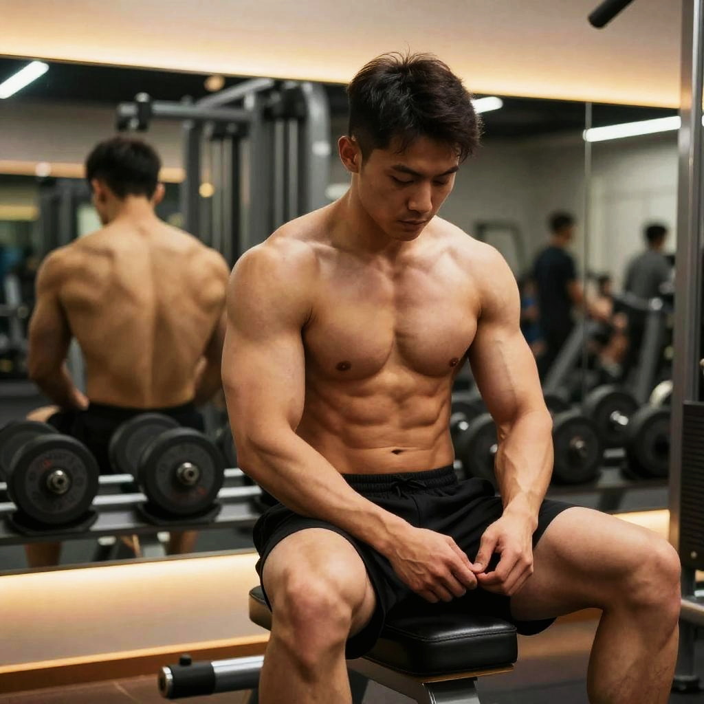 Powerful male poses inside a dimly lit gym, a focused man lifting heavy weights with veins visible, sweat dripping, strong jawline and broad shoulders emphasized by chiaroscuro lighting, conveying intense energy and focus.