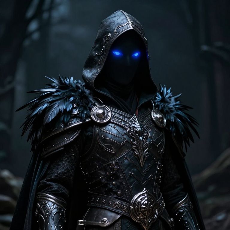 A hooded figure in ornate armor with glowing blue eyes and a feathered cloak stands in a dark, ominous environment.