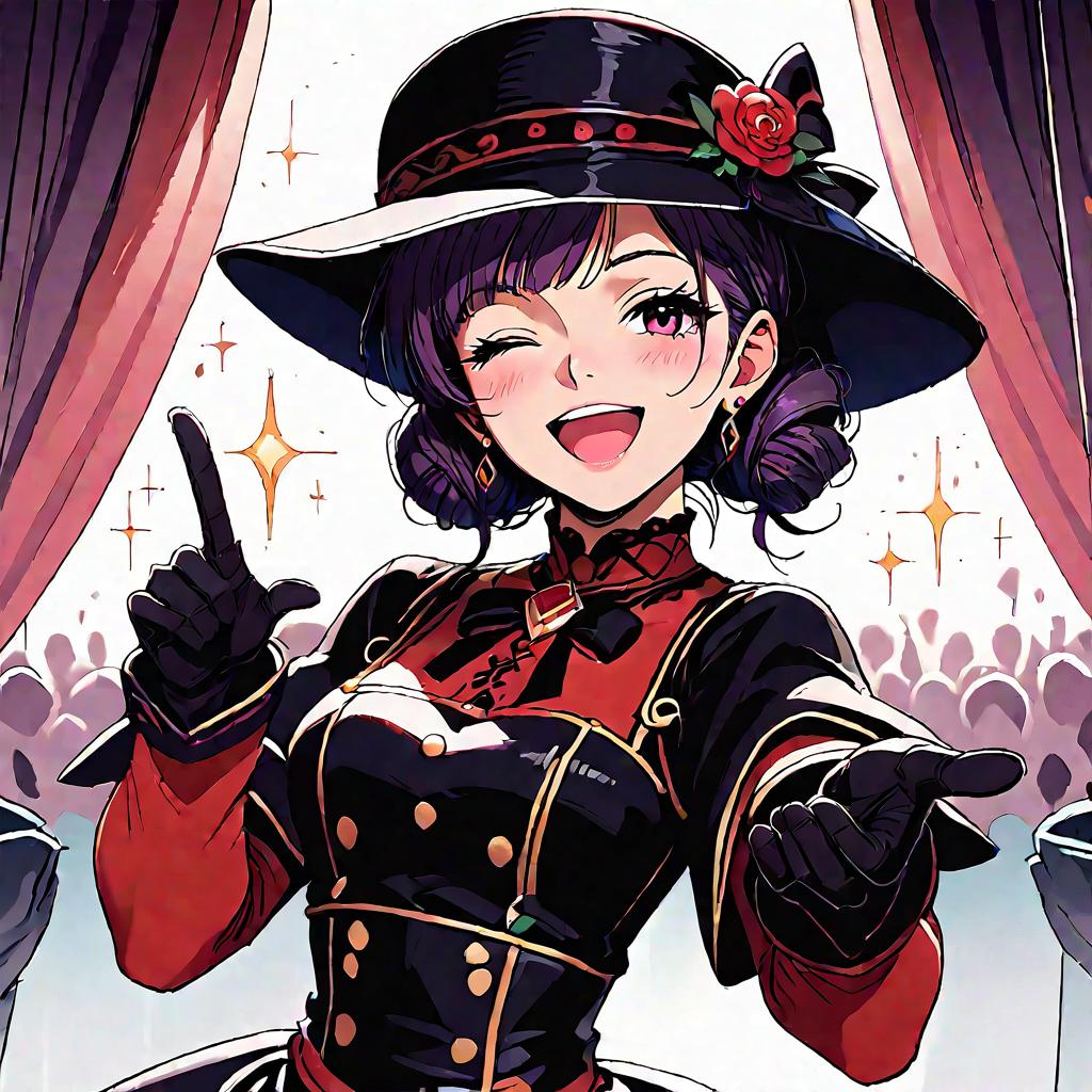 Score_9, score_8_up, score_7_up, score_6_up, score_5_up, score_4_up, best quality, high quality, rating_explicit, source_anime, digital illustration, pixiv, 1girl, arima kana, oshi no ko, solo, idol, idol clothes, one eye closed, red shirt, black skirt, black headwear, gloves, stage light, singing, open mouth, crowd, smile, pointing at viewer