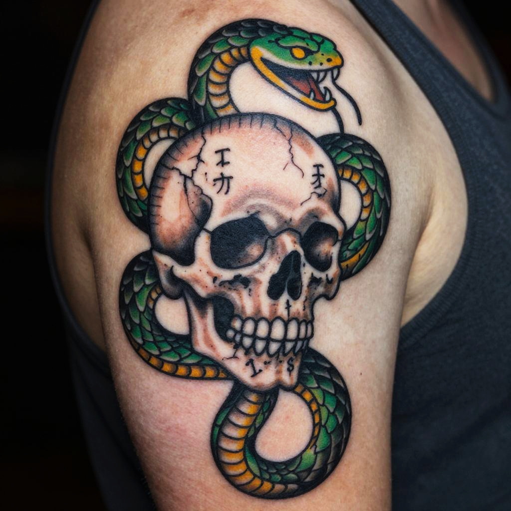 Tattoo of a green and yellow snake coiled around a cracked, skull with stitches on a muscular arm, wearing a dark tank top. Phot