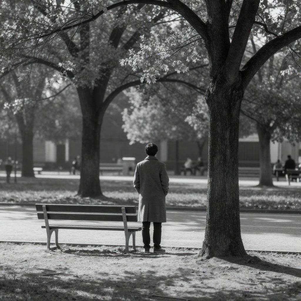 Black-and-white photograph of a park scene. A solitary figure in a long coat stands under a tree, facing away from the camera. A bench is positioned to the left, with another tree in the background. Sunlight filters through the trees, casting shadows on the ground.