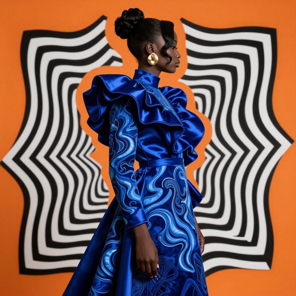 Photograph of a young Black woman with medium brown skin and black, wavy hair with bangs. She wears a black wide-brimmed hat, a sheer maroon long-sleeve blouse with gold geometric patterns, and a green high-waisted skirt adorned with gold floral embroidery. She has gold hoop earrings and a serious expression. The background features a black and white maze-like pattern. The overall style is modern and stylish, with a bold, geometric contrast. The image has a high-contrast, graphic quality.
