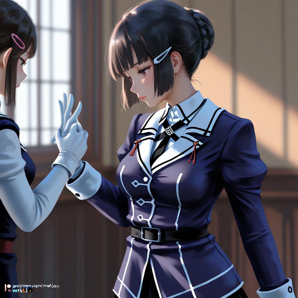 Myoukou kai ni (kancolle), kantai collection, 1girl, brown eyes, single hair bun, black hair, long hair, brown hair, braided bun, hairclip, medium breasts, military uniform, white gloves, military uniform, long sleeves, by artist wlop, illustrious