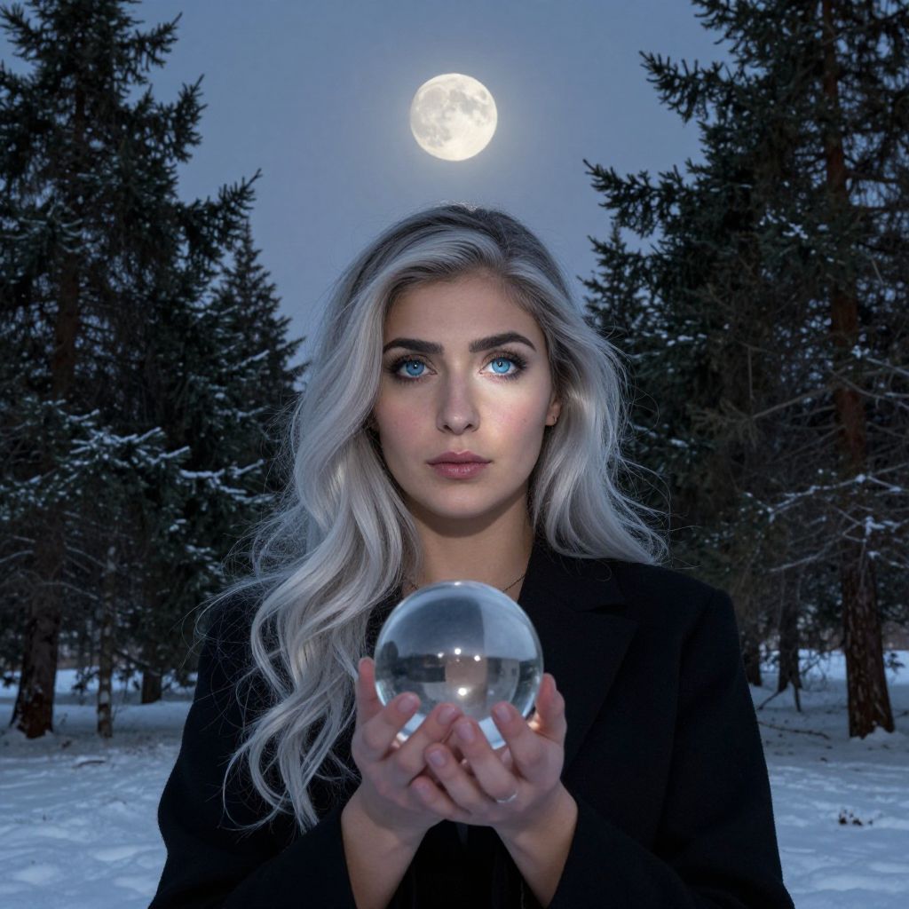 Photographic-style digital art: Silver-haired woman with blue eyes holding a crystal ball, moonlit snowy forest background, black coat, serene expression.