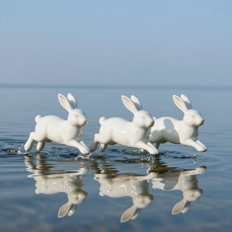 Porcelain rabbits gallop in unison across a tranquil ocean, their ceramic forms reflected perfectly in the glassy surface as they trigger gentle ripples that shimmer beneath the clear sky.