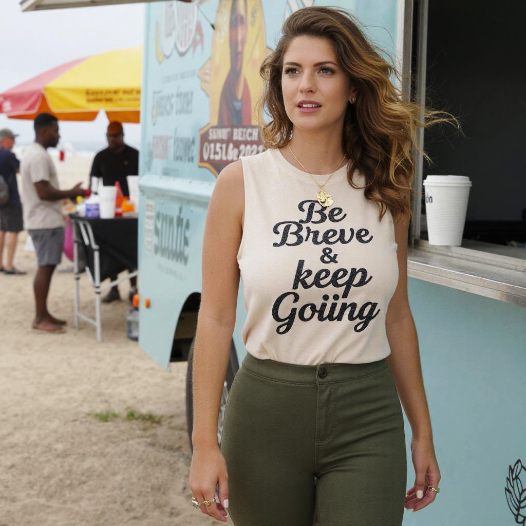 Photograph of a woman with wavy brown hair standing outdoors near a blue food truck. She wears a white sleeveless top with black cursive text reading "Be Brave & Keep Going" and olive green high-waisted pants. Her skin is fair, and she has a confident expression. A white paper cup is on the truck's window ledge to her right. In the background, an orange and yellow tent, a man in a white shirt, and other people are visible. The ground is sandy, and the setting appears to be a casual outdoor event.