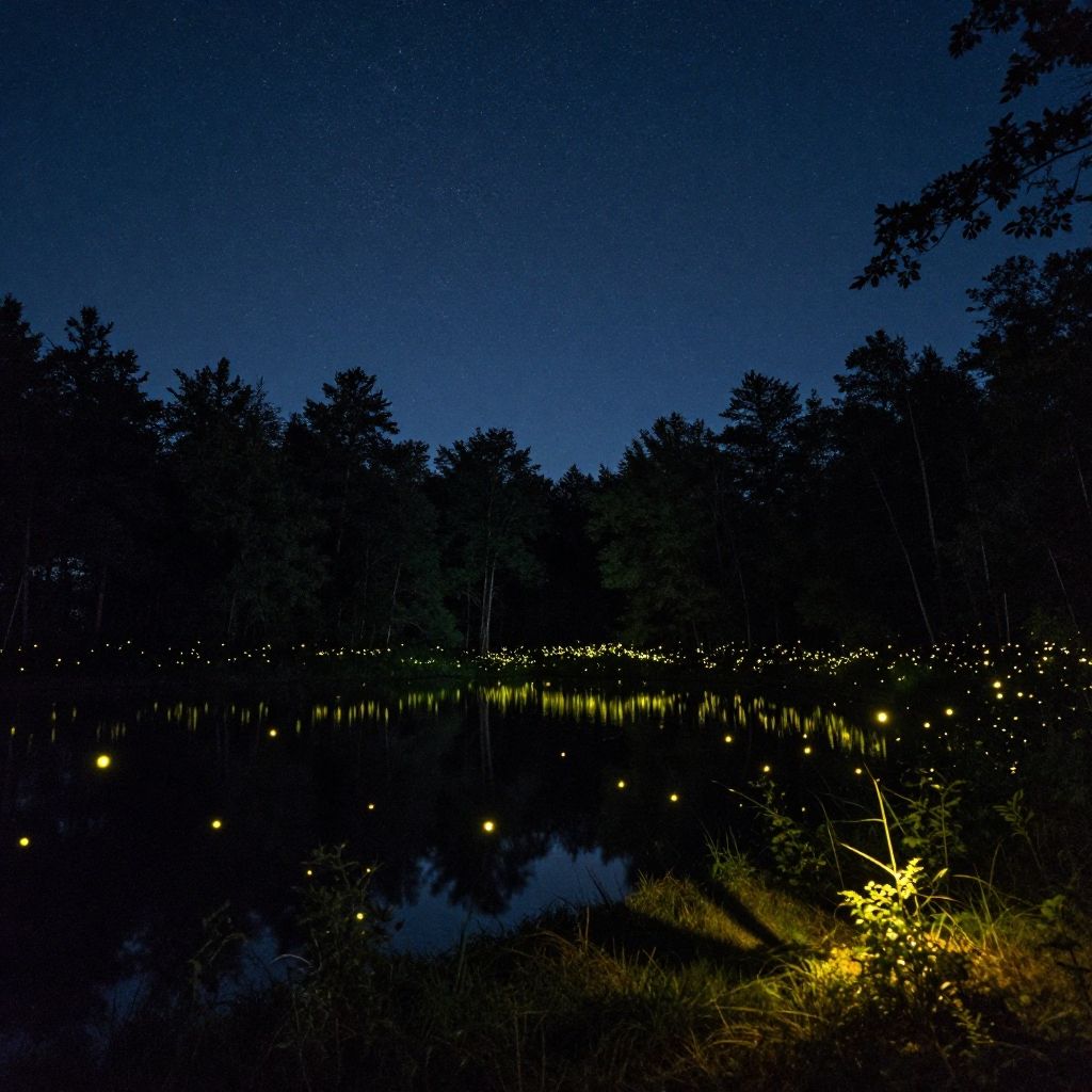 Nighttime background with a starry sky over a quiet forest lake, glowing fireflies illuminating the scene, soft moonlight casting gentle shadows, serene and peaceful atmosphere