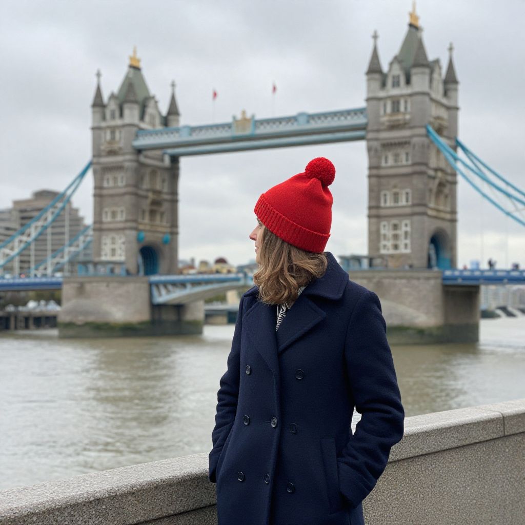 Woman standing by the River Thames, wearing a red bobble hat and navy coat, with Tower Bridge in the background under overcast skies.