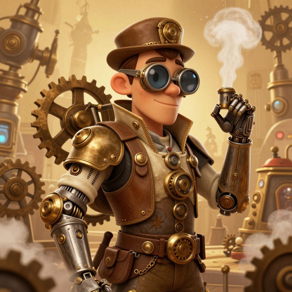 Steampunk-style cartoon man with goggles, bronze armor, and mechanical arm, holding a smoking device, surrounded by gears and machinery.