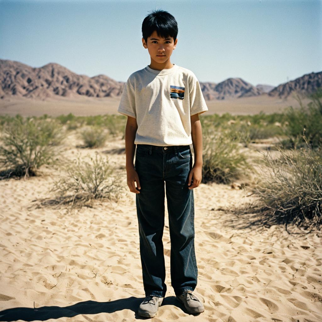 4991b5f1cd918481fc047f82efbb97a2 sandy,1boy, realistic, solo, male focus, shirt, desert, black hair, outdoors, pants, standing, day