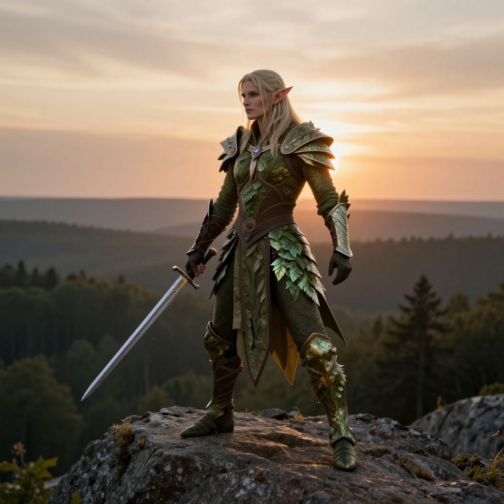 Elfint warrior clad in elegant leaf-patterned armor, standing on a rocky outcrop during sunset, majestic forest stretching into distance, magical aura glowing faintly, dynamic pose with a slender sword, high fantasy style with rich textures.