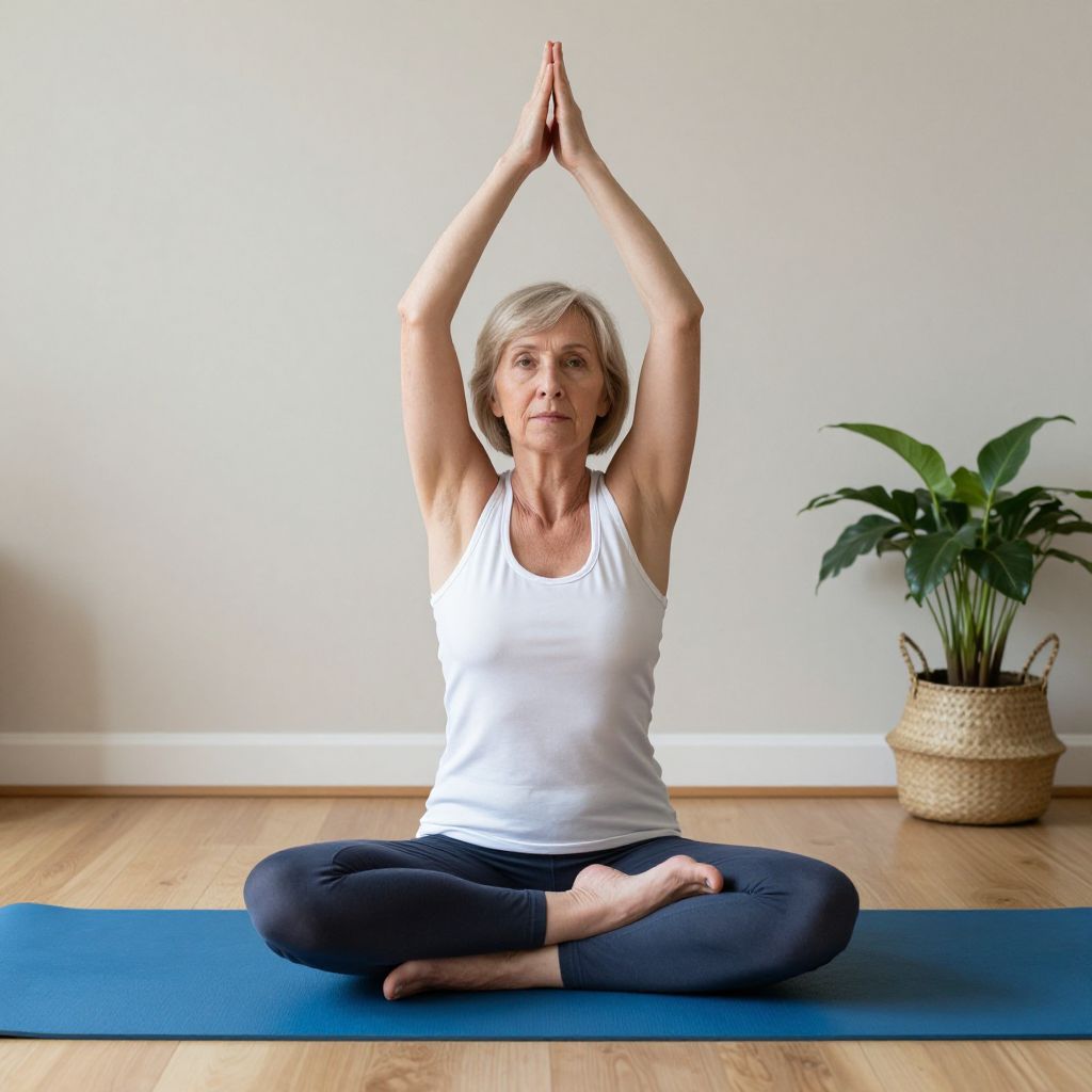 Photograph of an elderly woman with short gray hair, wearing a white tank top and black yoga pants, sitting cross-legged on a blue yoga mat. She is in a meditation pose with her arms raised and hands pressed together above her head. The background is a plain white wall with a wooden floor and a green potted plant in a woven basket to the right. The image is well-lit with natural light, emphasizing her focused expression and calm demeanor.