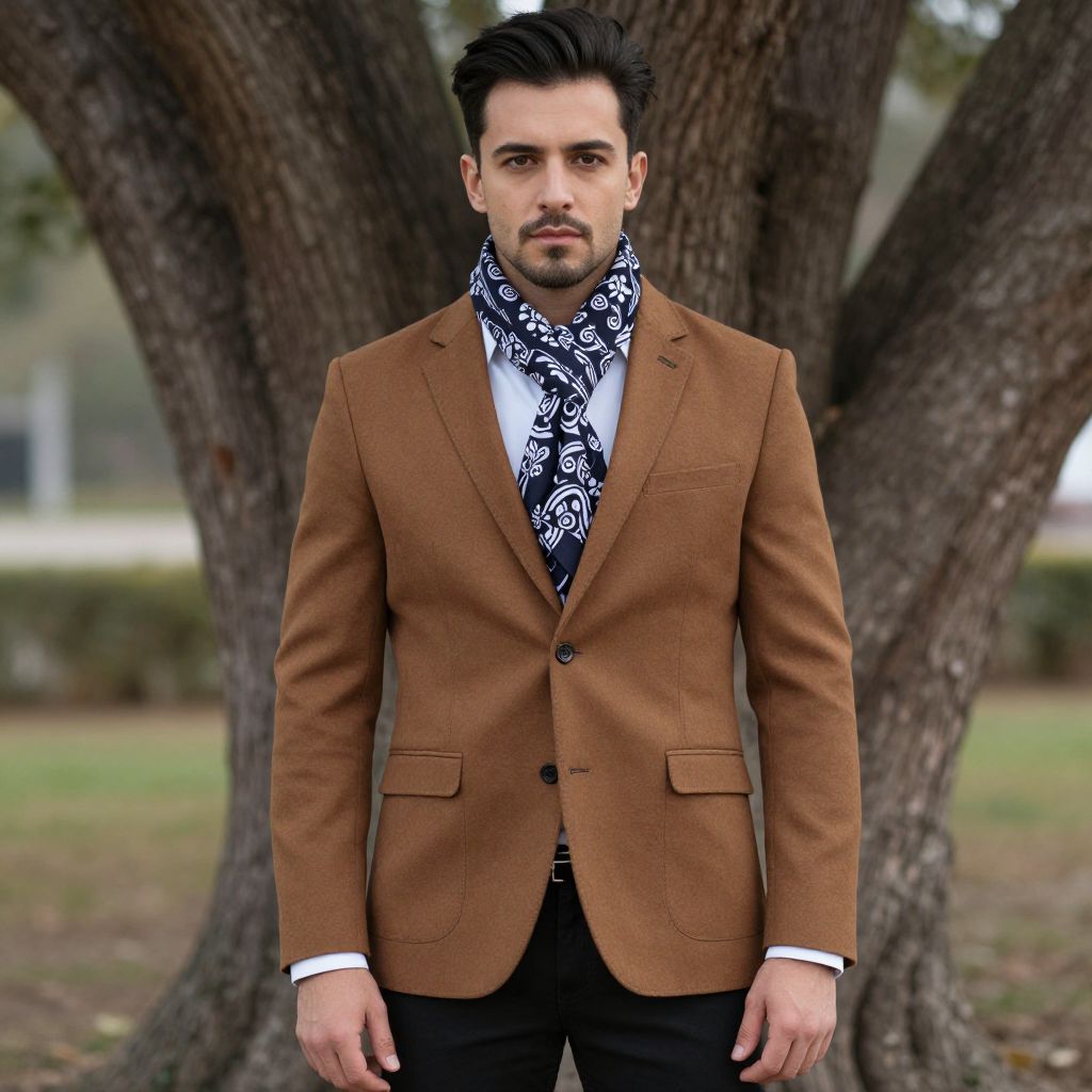 Perfect Man Wear Costume, man in brown jacket and scarf standing in front of a tree