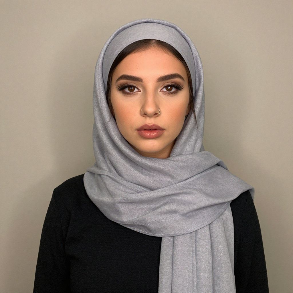 Photograph of a young woman with light olive skin, dark brown eyes, and full lips adorned with pink lipstick. She wears a light gray hijab that covers her head and neck, with the fabric softly draped around her shoulders. Her eyebrows are dark and well-defined, and she has a small, silver nose ring in her right nostril. She is dressed in a black top. The background is a plain, light gray wall, creating a neutral and simple setting that focuses attention on her. The lighting is even, highlighting her facial features and the texture of the hijab.
