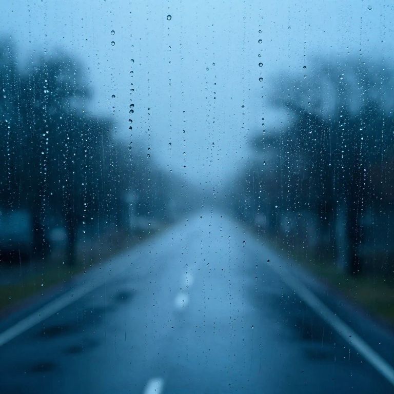 Electric-blue raindrops cascade down a misty window, creating a dreamlike, cyberpunk-inspired scene where the blurred road below reflects the melancholic beauty of a forgotten lullaby, evoking a high-definition, atmospheric visual effect.